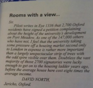 I was chuffed to see that the latest issue of Private Eye (number 1337) had printed my letter about the university's controversial Port Meadow development here in Oxford.